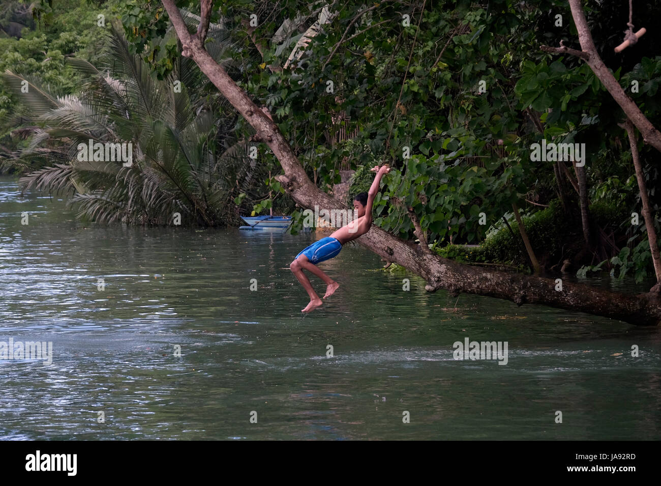 A Young Filipino Boy Swings On A Rope At The Loboc River In The