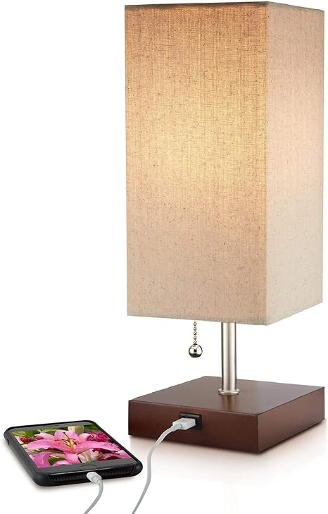 Hngchoige Wood Base Fabric Shade Bedside Table Lamp With Usb Port